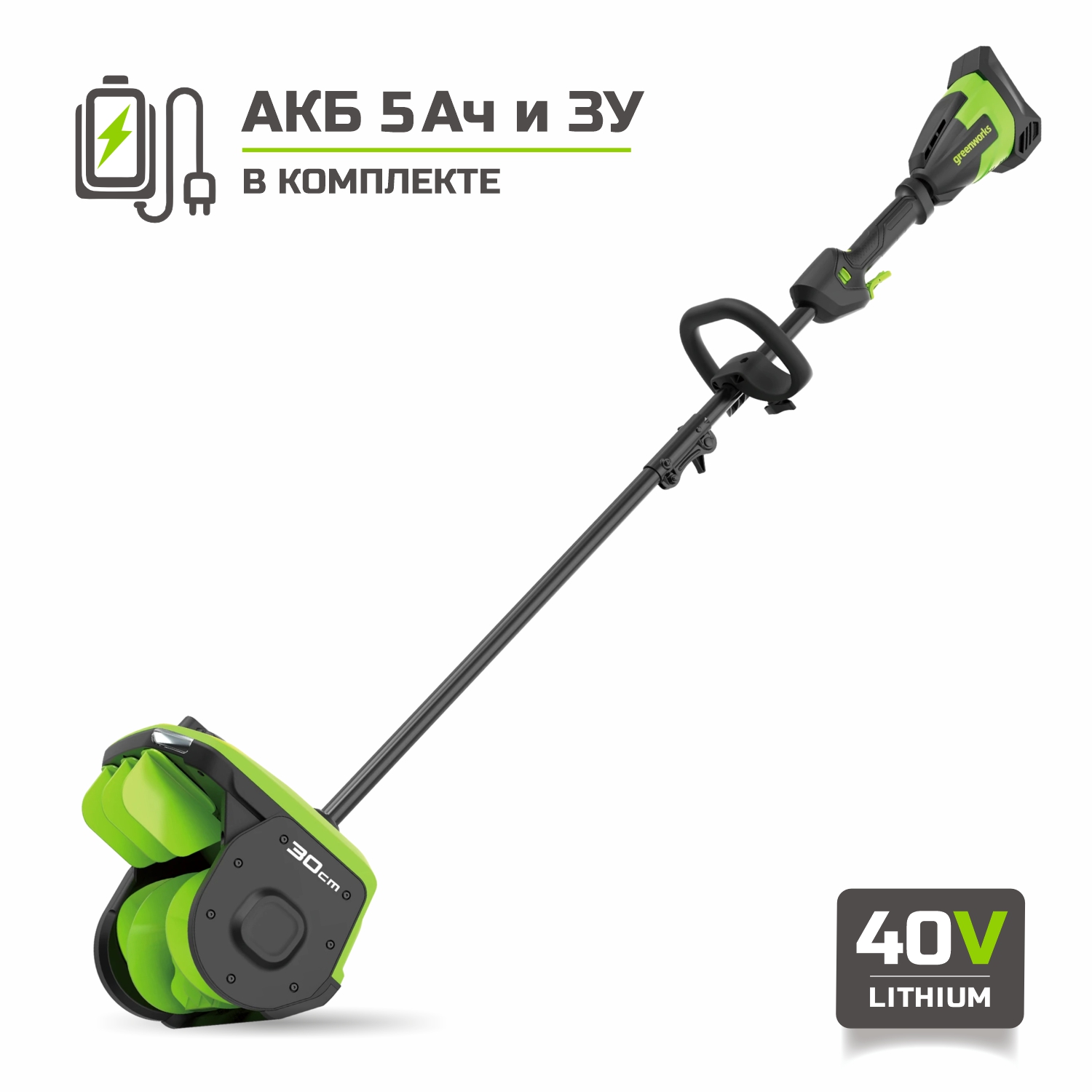 Снегоуборщик аккумуляторный Greenworks GD40SS2, 40V, 30 см, с АКБ 5 Ач и ЗУ