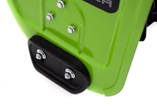 Модель имеет прочные боковые резаки (снегообрушители) и инструмент для очистки разгрузочного желоба от снега. Использование в условиях недостаточной освещённости облегчают светодиодные фары: передние и 2 боковые. Повышенная проходимость снегоуборщика обеспечивается широкими колесами 38х13 см с мощным протектором.