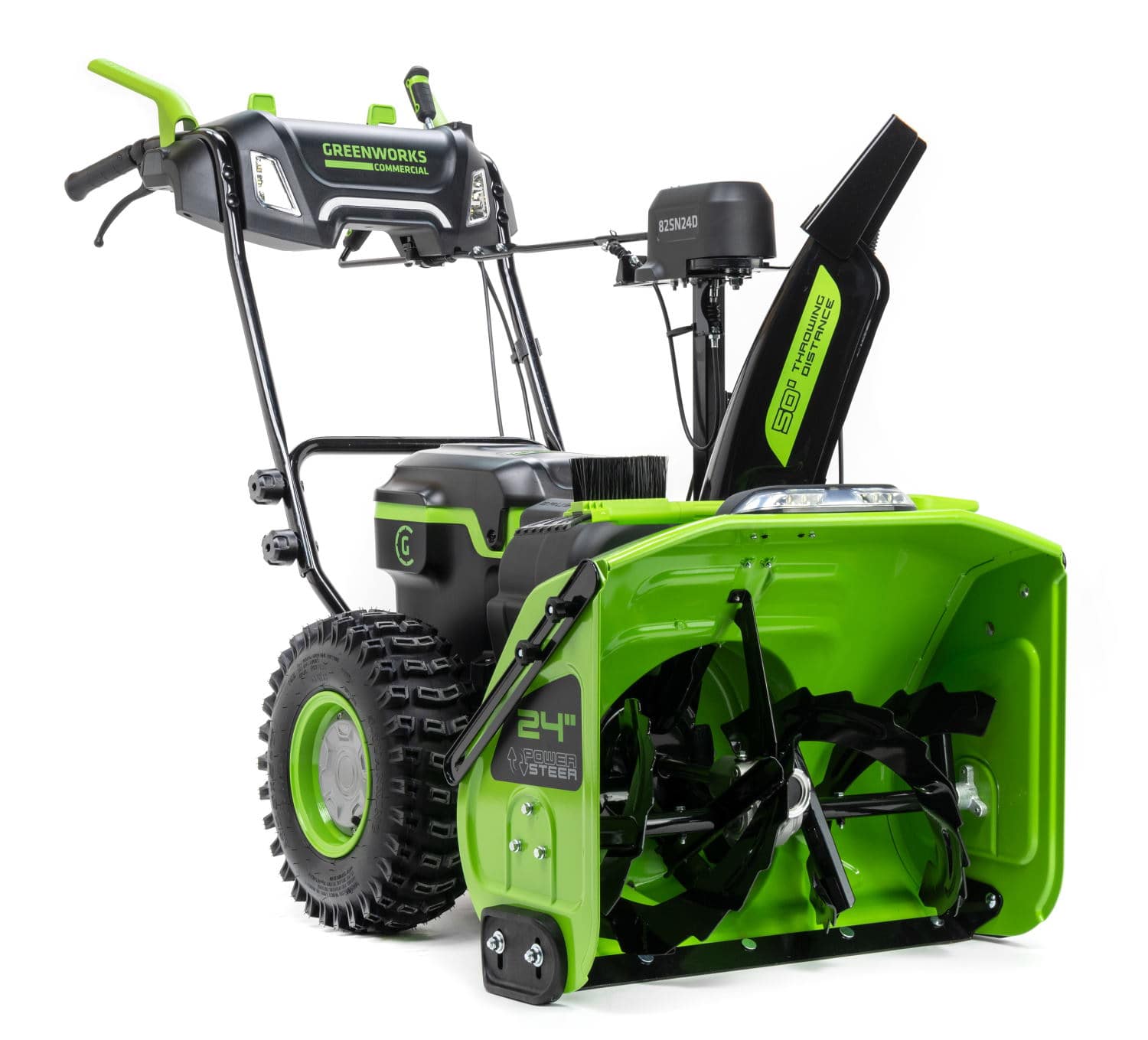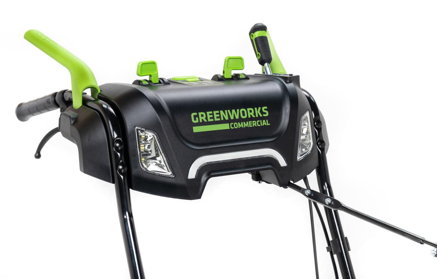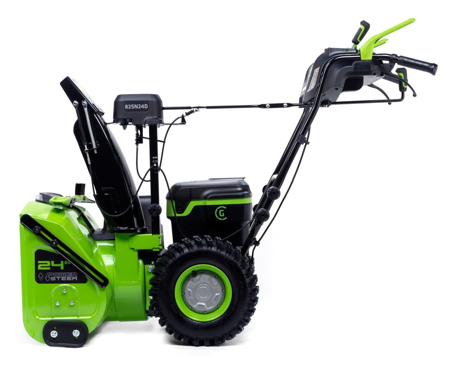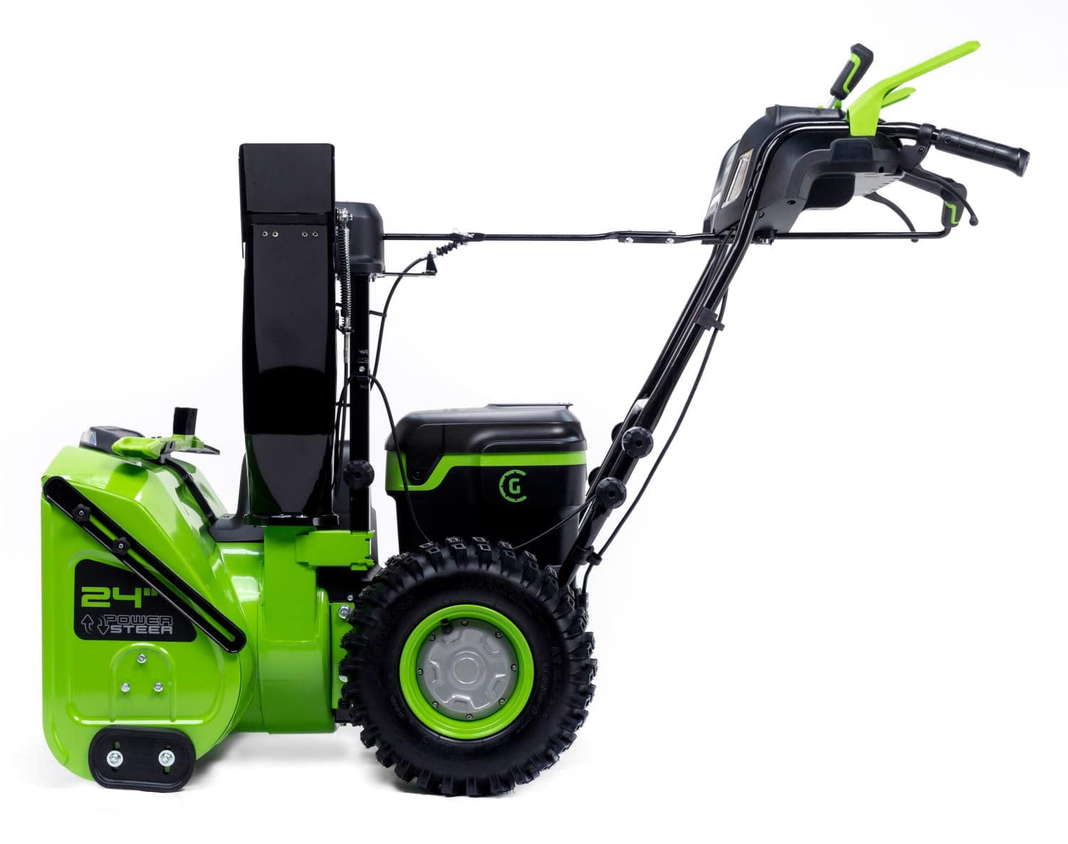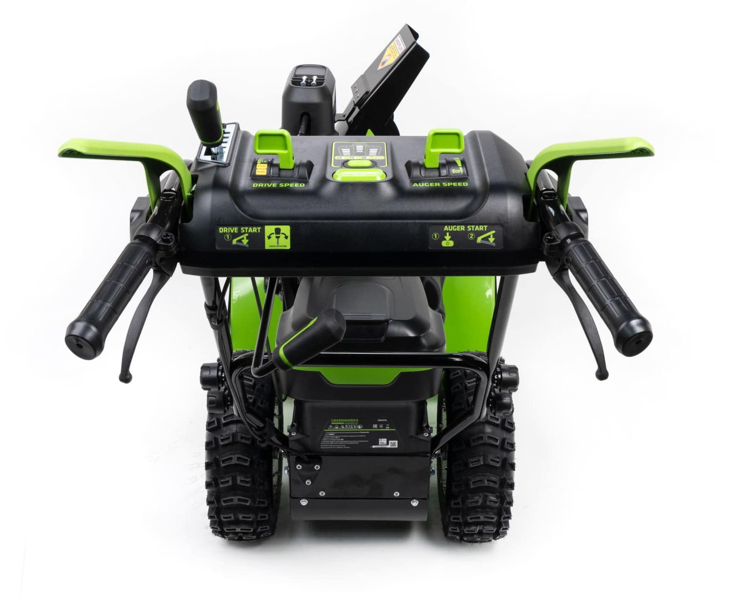 Эта модель – первый самоходный снегоуборщик в линейке техники Greenworks, он имеет 3 передних и одну заднюю скорость, а также оснащен системой разворота на месте Zero Turn. Ширина захвата снега – 51 см, глубина – 25 см. Регулировка направления выброса в пределах 200 градусов осуществляется рычагом на панели управления. Рычаг регулировки угла (и дальности) выброса от 0 до 80 градусов также находится под рукой у оператора – под панелью управления. Вы задаете направление, а все остальное делает сам снегоуборщик!