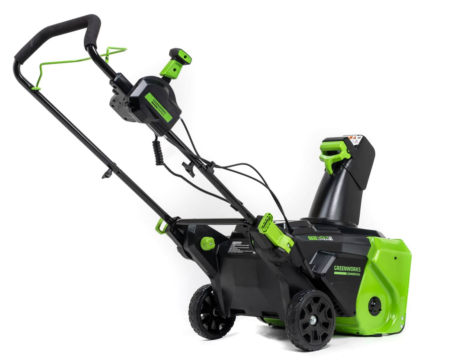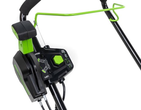 Для безопасного включения предусмотрена кнопка-предохранитель, как и на всей аккумуляторной технике Greenworks. Ручка имеет складную конструкцию. Снегоуборщик работает от аккумуляторной батареи 82V (2,5 или 5 Ампер/час), которую можно использовать с другими с устройствами Greenworks из линейки 82V.