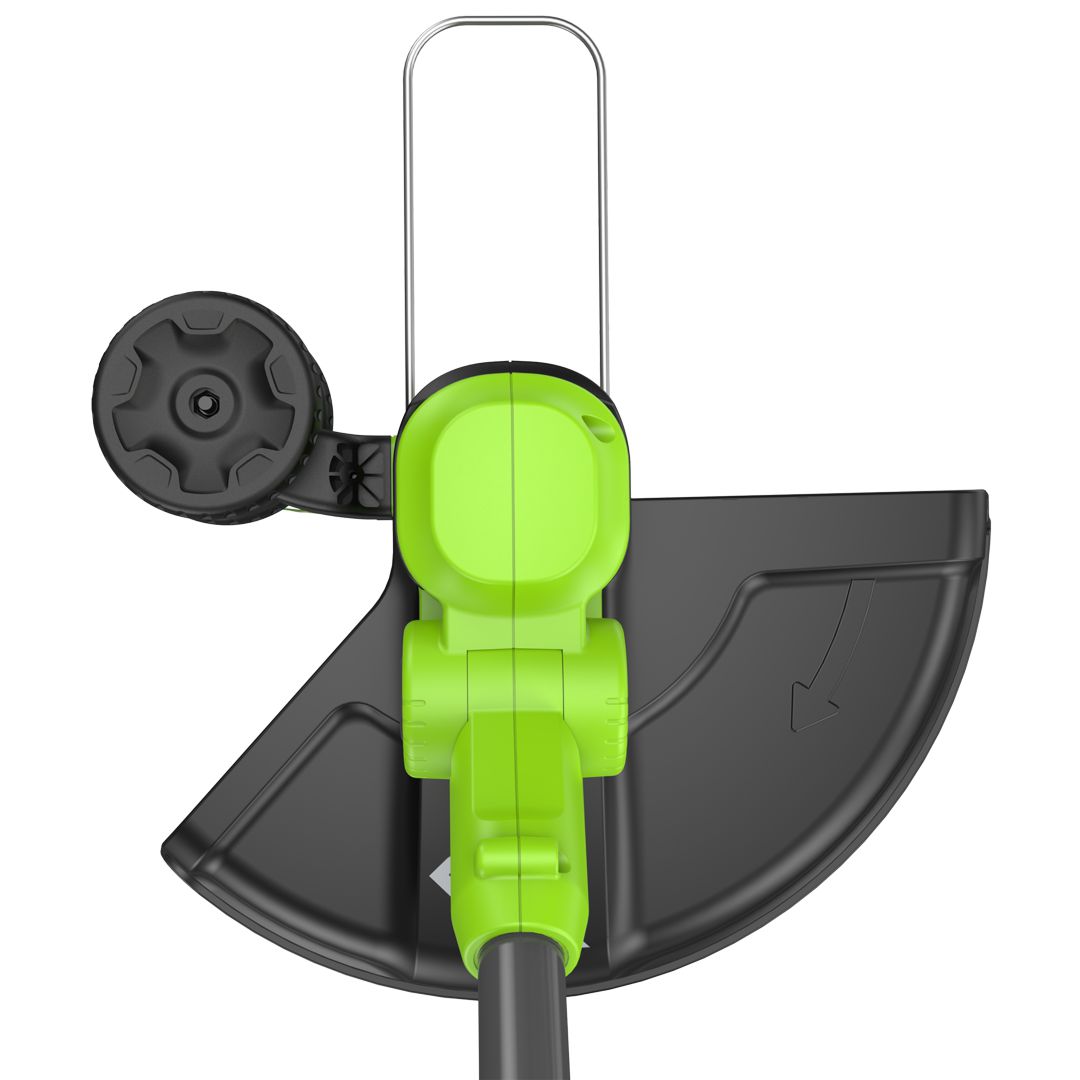 Триммер удобен в использовании благодаря нижнему расположению мотора, сбалансированной конструкции и возможности регулировки угла наклона режущей головки. Автоматическая подача лески активируется при включении, а скорость вращения регулируется переключателем и степенью нажатия на курок. Защитная скоба предотвращает случайное повреждение окружающих предметов. D-образная рукоятка настраивается под рост пользователя и дополнена наплечным ремнем для снижения нагрузки на руки. Разборная штанга облегчает транспортировку и хранение триммера.