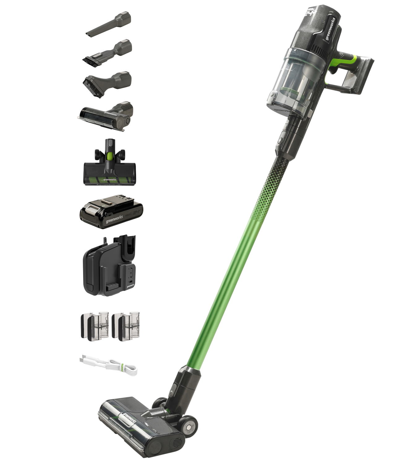 Вертикальный аккумуляторный пылесос Greenworks G24SVK4 24V 4700607 (500 Вт) имеет расход воздуха 21 л/с, контейнер 0,5 л, LED-дисплей и 5 различных насадок в комплекте. Оснащен бесщеточным двигателем 500 Вт. Пылесос эффективно справляется с уборкой и имеет полный комплект насадок для различных задач: универсальная электрощетка, мини-электрощетка для уборки шерсти животных, щелевая насадка, насадка-щетка, насадка 2-в-1 (удобна для уборки в салоне автомобиля).
