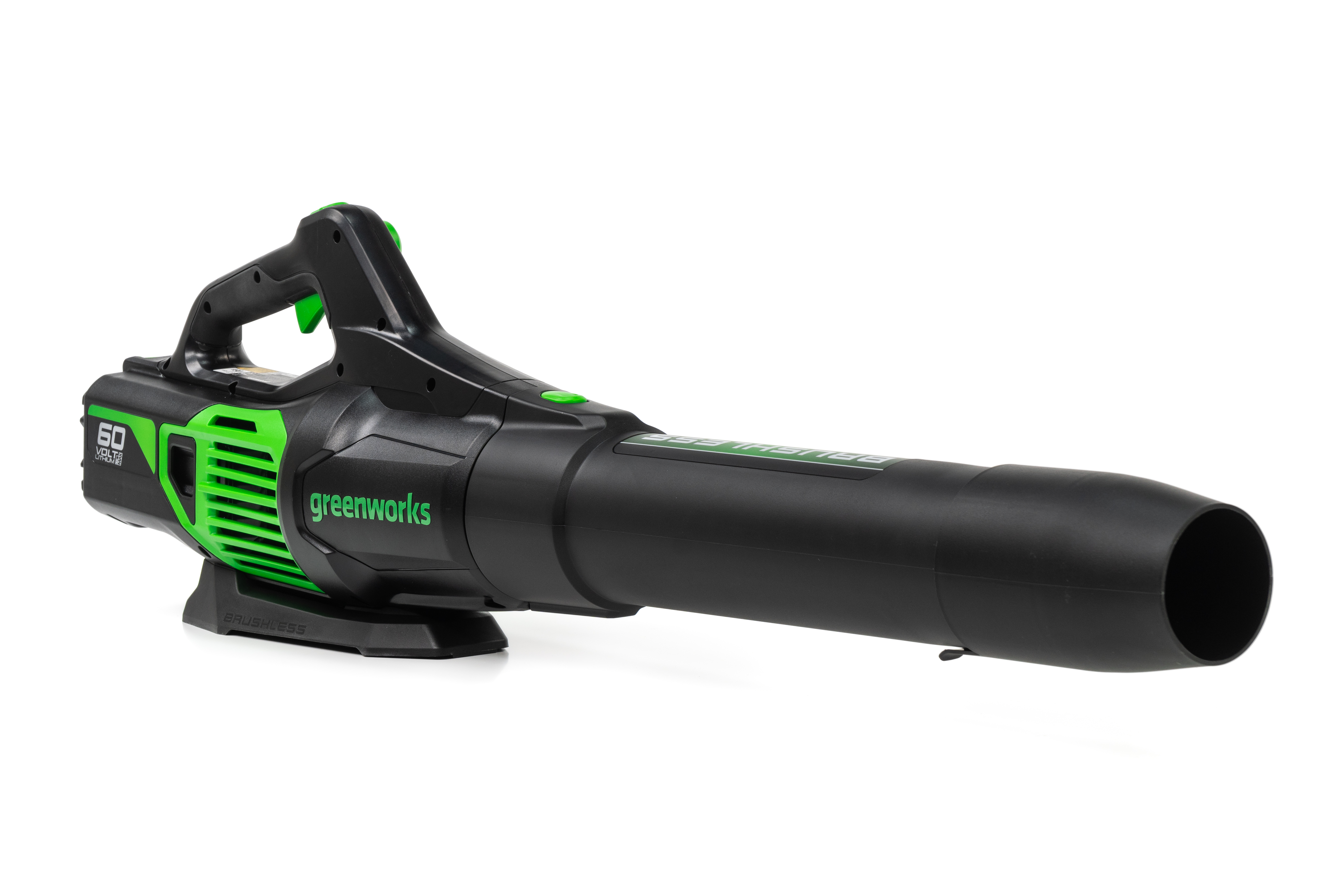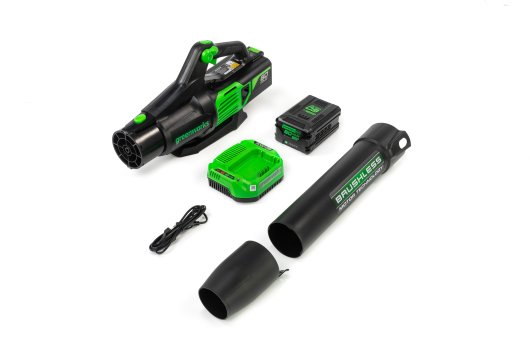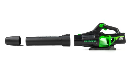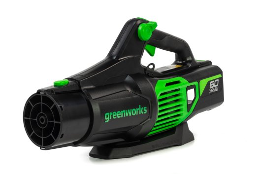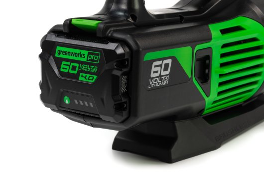 Воздуходув работает от аккумуляторной батареи 60V, которая подходит ко всем устройствам из линейки Гринворкс 60V.