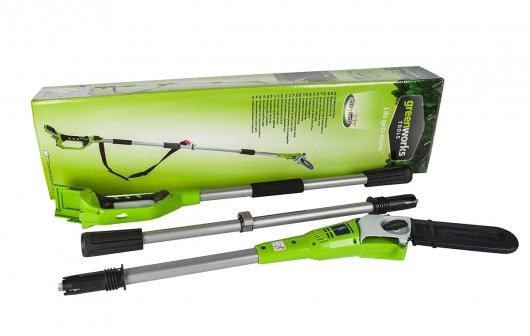 Высоторез-сучкорез аккумуляторный Greenworks G24PS20 - специально разработан для подрезки веток и сучьев у деревьев на достаточной высоте, чтобы не пользоваться лестницами. Составная конструкция устройства позволяет менять длину от 155 до 205 см. - это позволит с легкостью осуществить подрезку на высоте до 4-х метров от земли. Этот садовый высоторез оснащается цепной пилой с пильной шиной из кремнистой стали и цепью Oregon. Довольно легкий вес - 3.2 кг. является серьезным преимуществом в сравнение с бензиновыми аналогами, им проще и легче работать. А главное - электрический двигатель имеет низкий уровень шума и вибрации, экологичен и прост в эксплуатации. Он не требует замены свечей или фильтров, масла, подготовки топливной смеси.